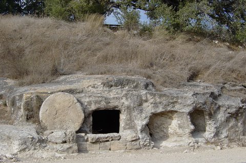 An ancient tomb with a rolling stone door