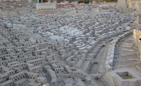 Jerusalem’s ancient model city pictures the Pool of Siloam in right foreground